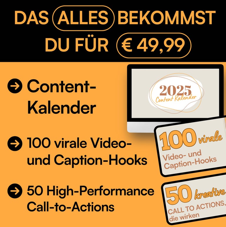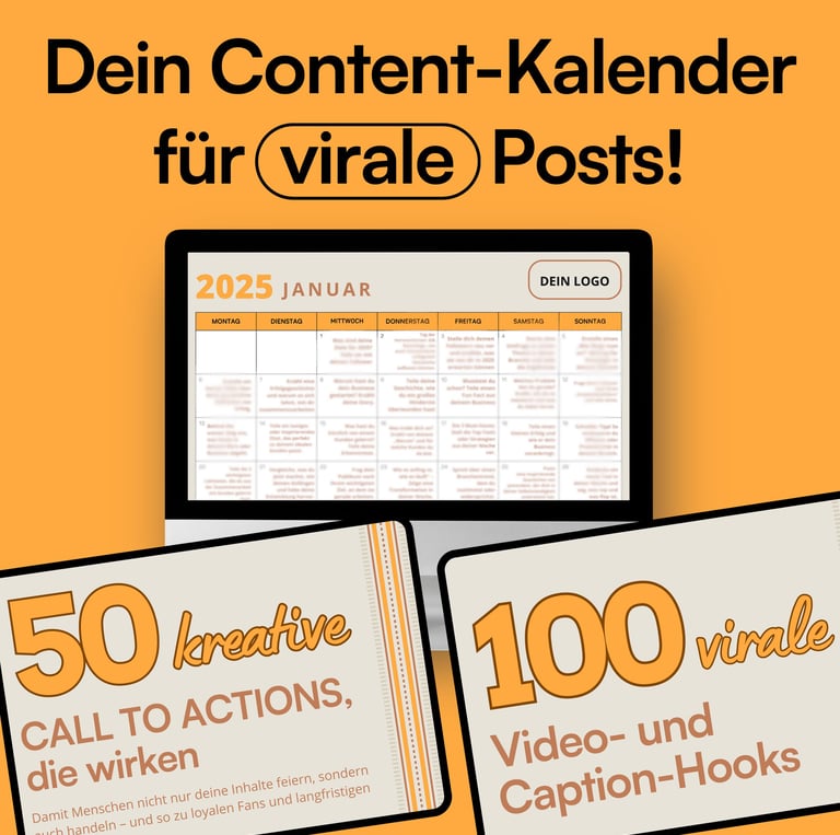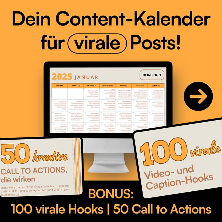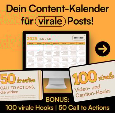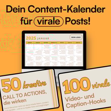 Wir haben über 900+ virale Beiträge analysiert und daraus einen kompletten Jahreskalender mit täglichen kreativen Content-Ideen entwickelt, der für jede Branche funktioniert. Egal, ob du Content Creator, Coach oder (Klein-)Unternehmer bist – unser Kalender liefert dir die perfekten Ideen, um in deinem Bereich viral zu gehen!